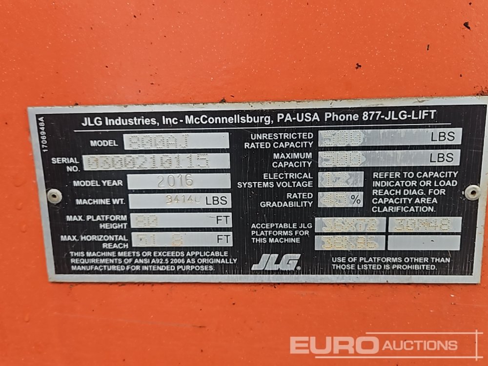 2016 JLG 800AJ 80′ Articulating Boom Lift, 45′ Horizontal Reach, Jib, DSL, 4WD, 500lb Capacity, Power to Platform, Proportional Controls, Oscillating Axle – 0300210115